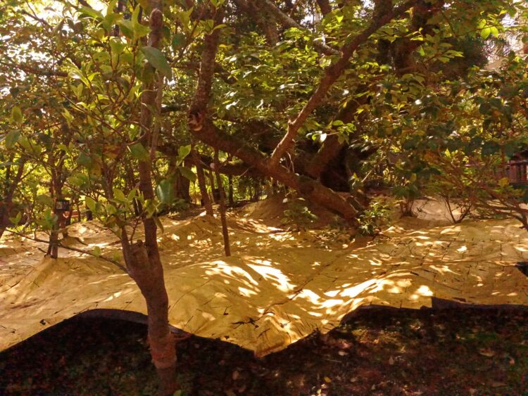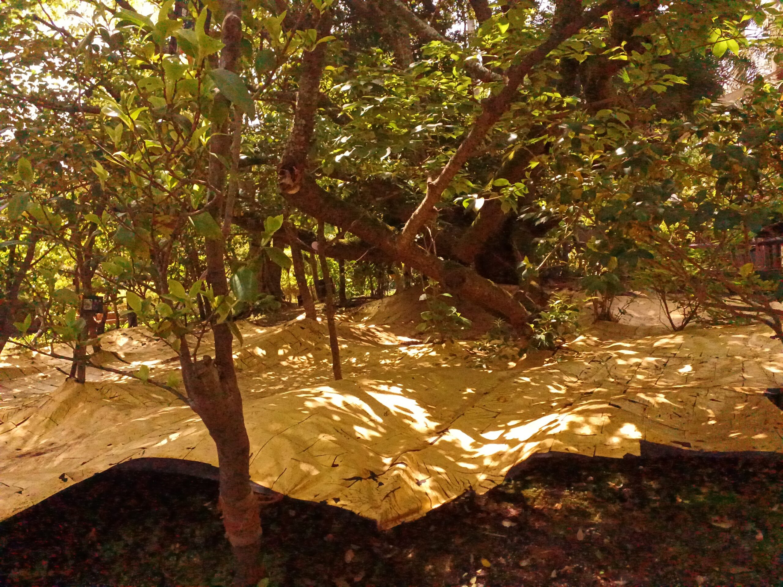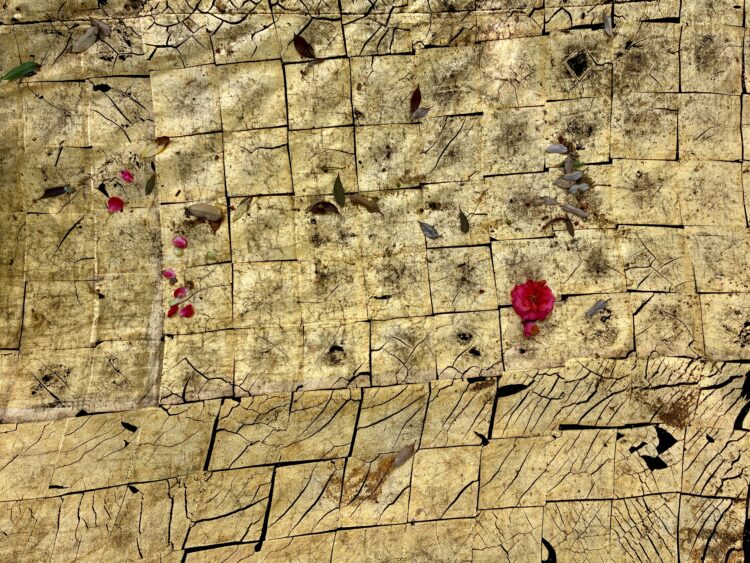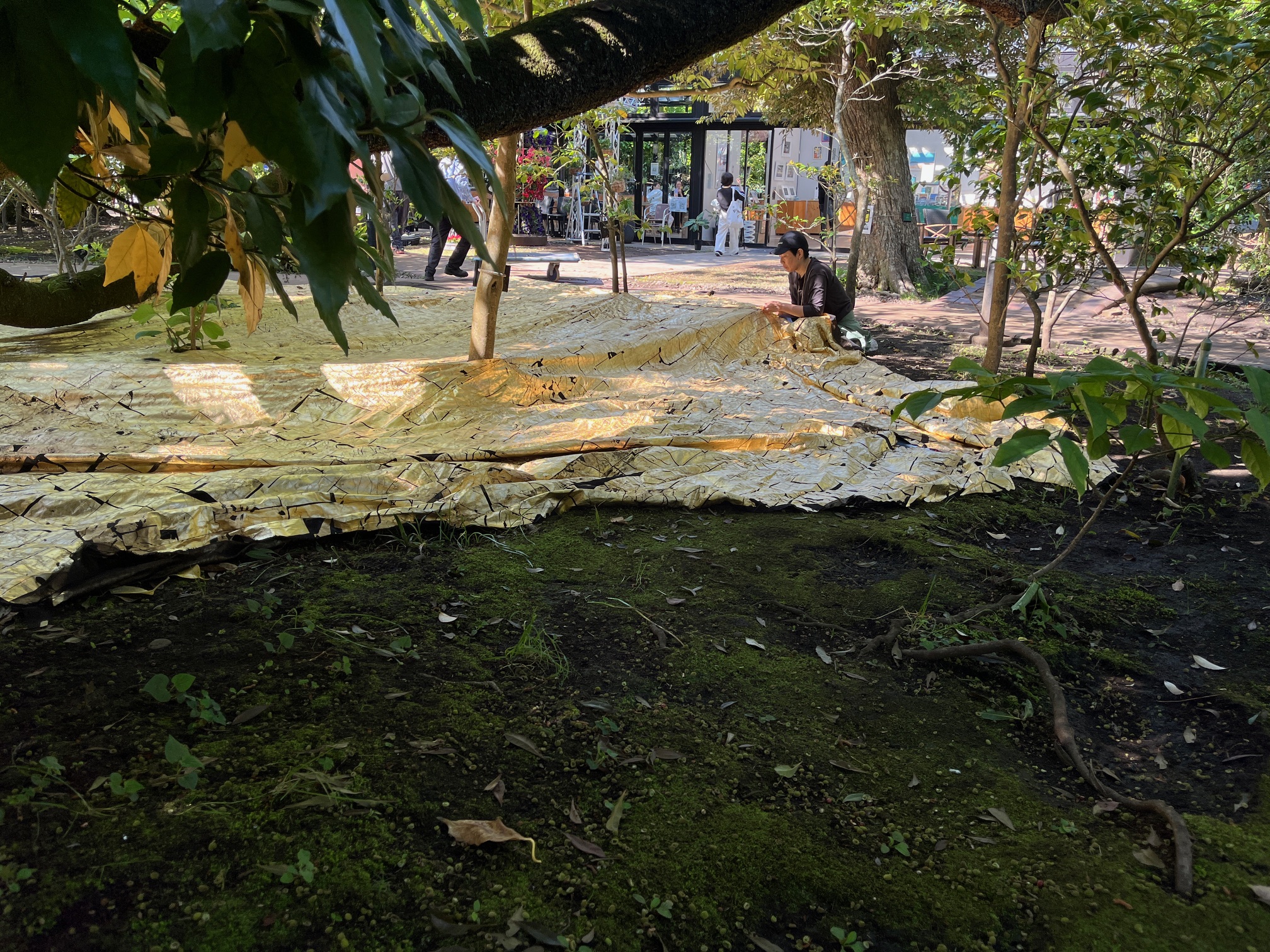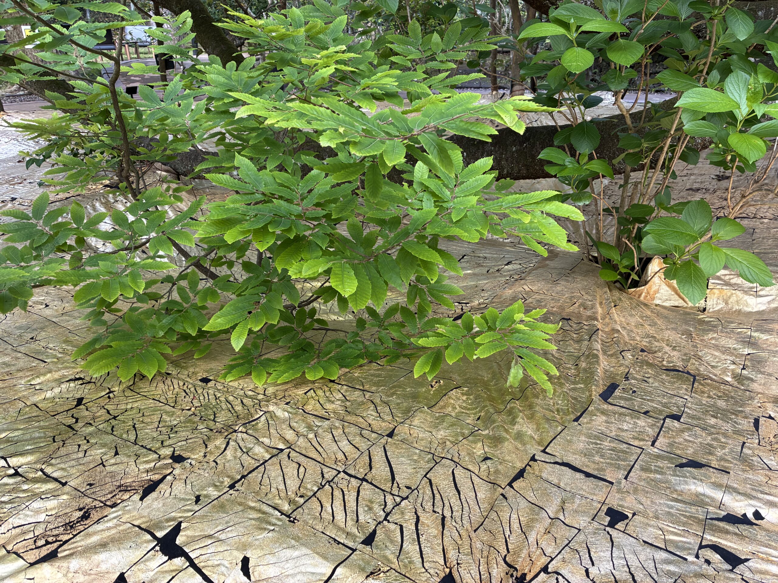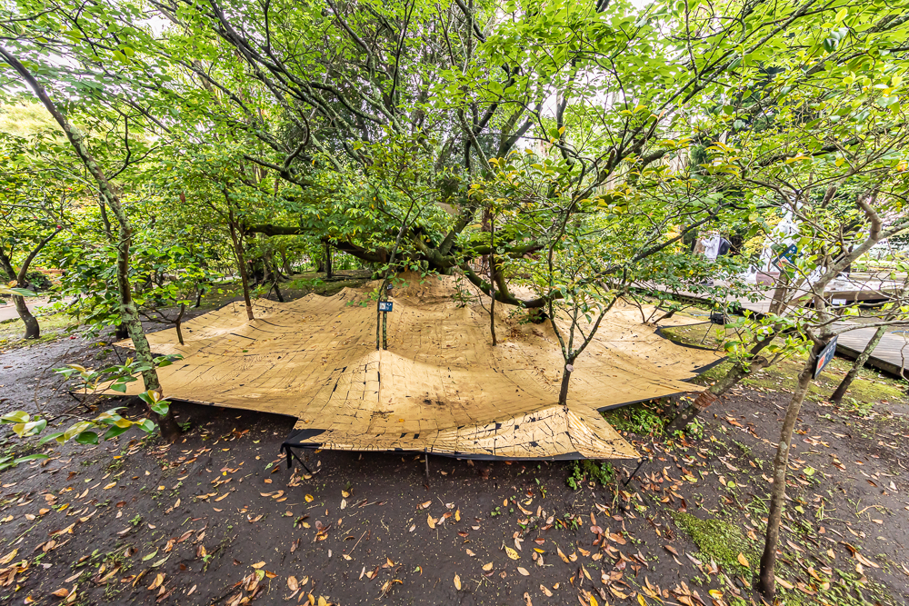 まだまだ元気に葉をつける大きな桜の倒木とその周りでリズムよく植えられた木々達の姿を浮き立たせる為、彼らの足元に金色の面を敷いた。