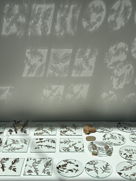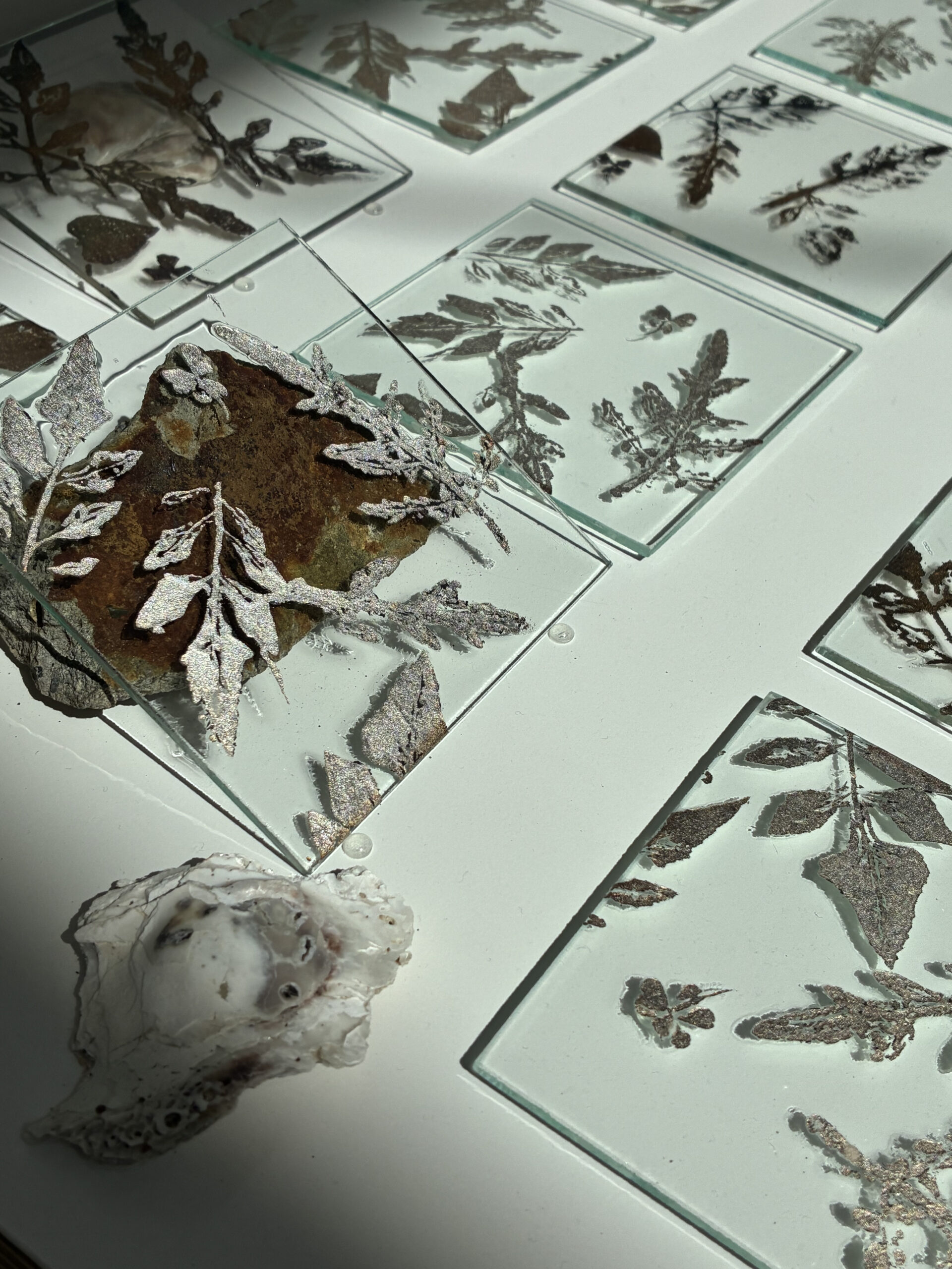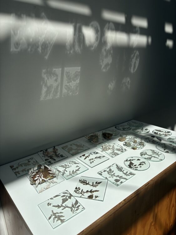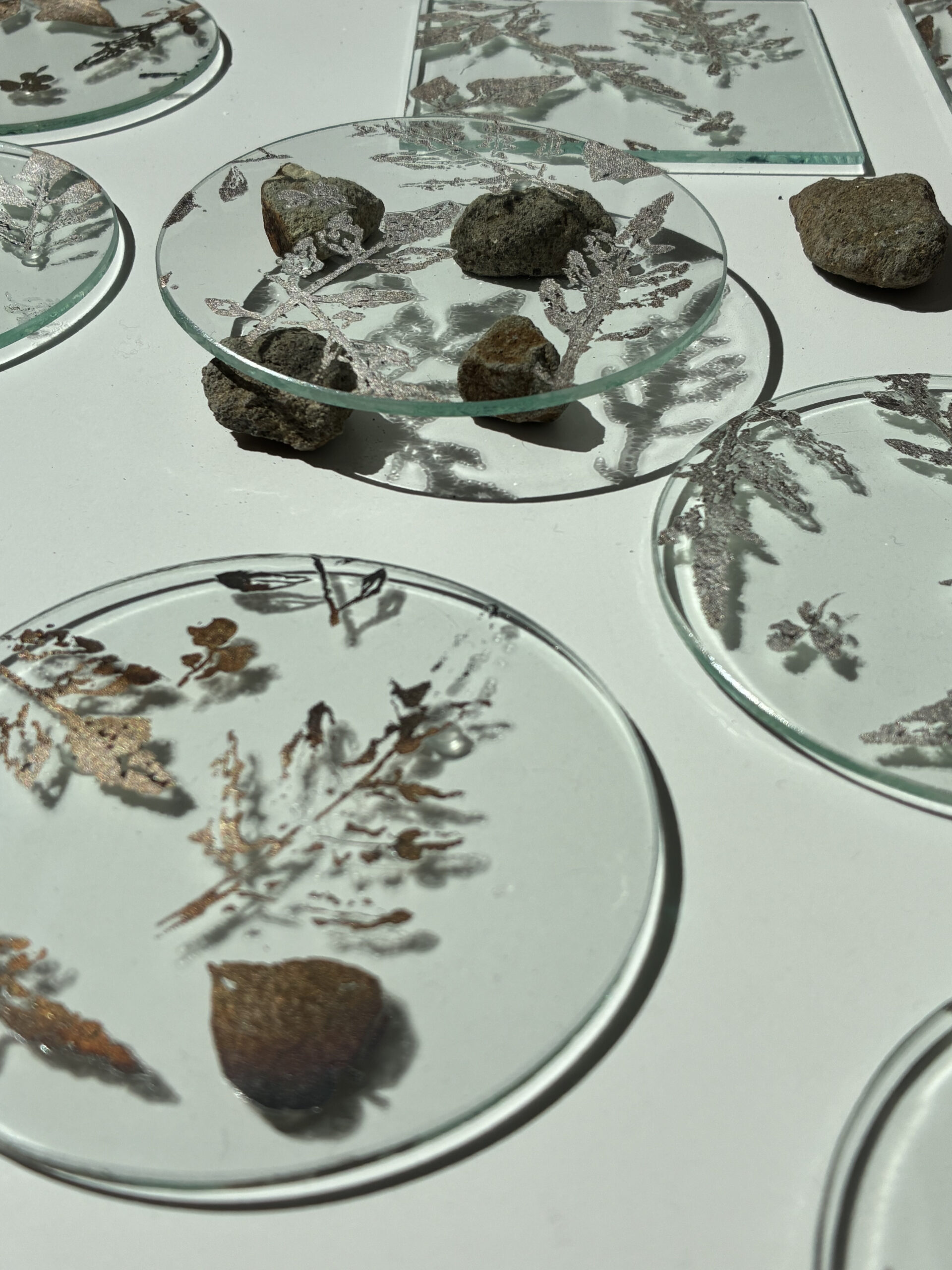 もどる ○□ ○□ (まるしかく) コースターサイズの小さなガラスの作品は、ハコベやクローバー、ヨモギなど春に咲く可愛らしい小さな野草からシルエットをいただき、銀箔で描いた作品。 (全36枚) サイズ:直径12cm、12×12cm 素材 :ガラス、銀箔 制作年:2025年 もどる