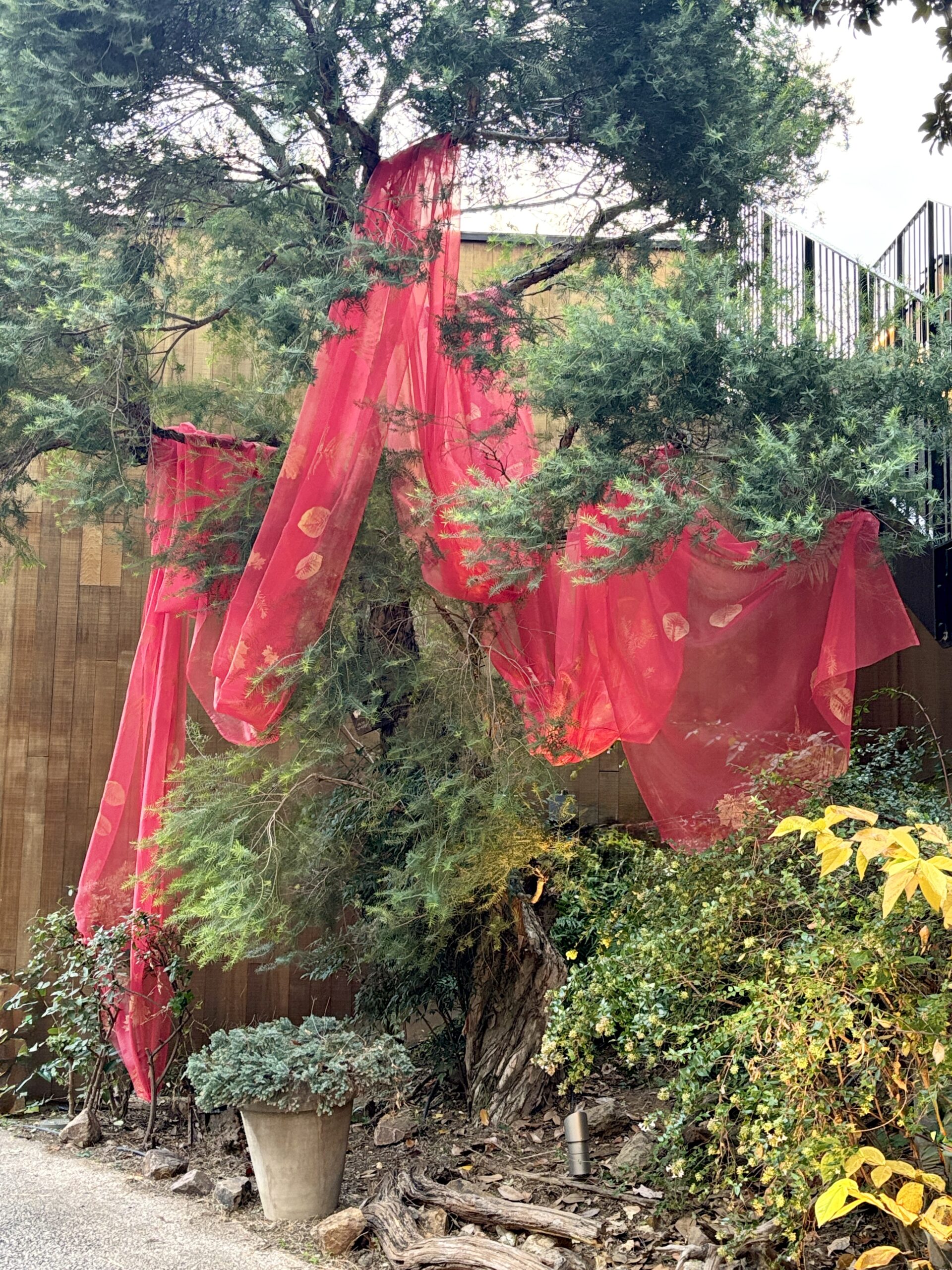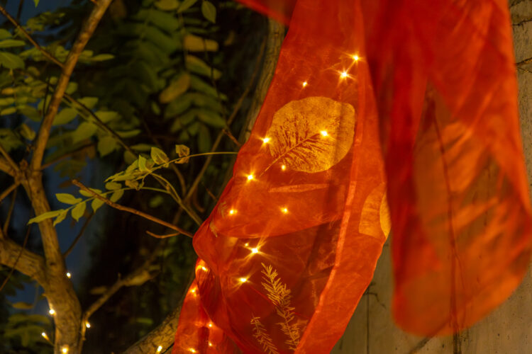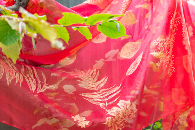 実際にログロードに生えているカエデ・スモークツリーやメラレウカスノーインサマーの葉・足元のシダなどを採取し、それぞれの美しい形をログロードの植栽Log(記録)としてオーガンジーに1枚ずつ手刷りしました。